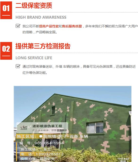 多年經(jīng)驗(yàn)偽裝波段范圍:可見(jiàn)光(380nm~760nm)和近紅外(760nm~1200nm); 外墻迷彩漆不是水漆。盡管水漆是一種環(huán)保型的涂料,;
